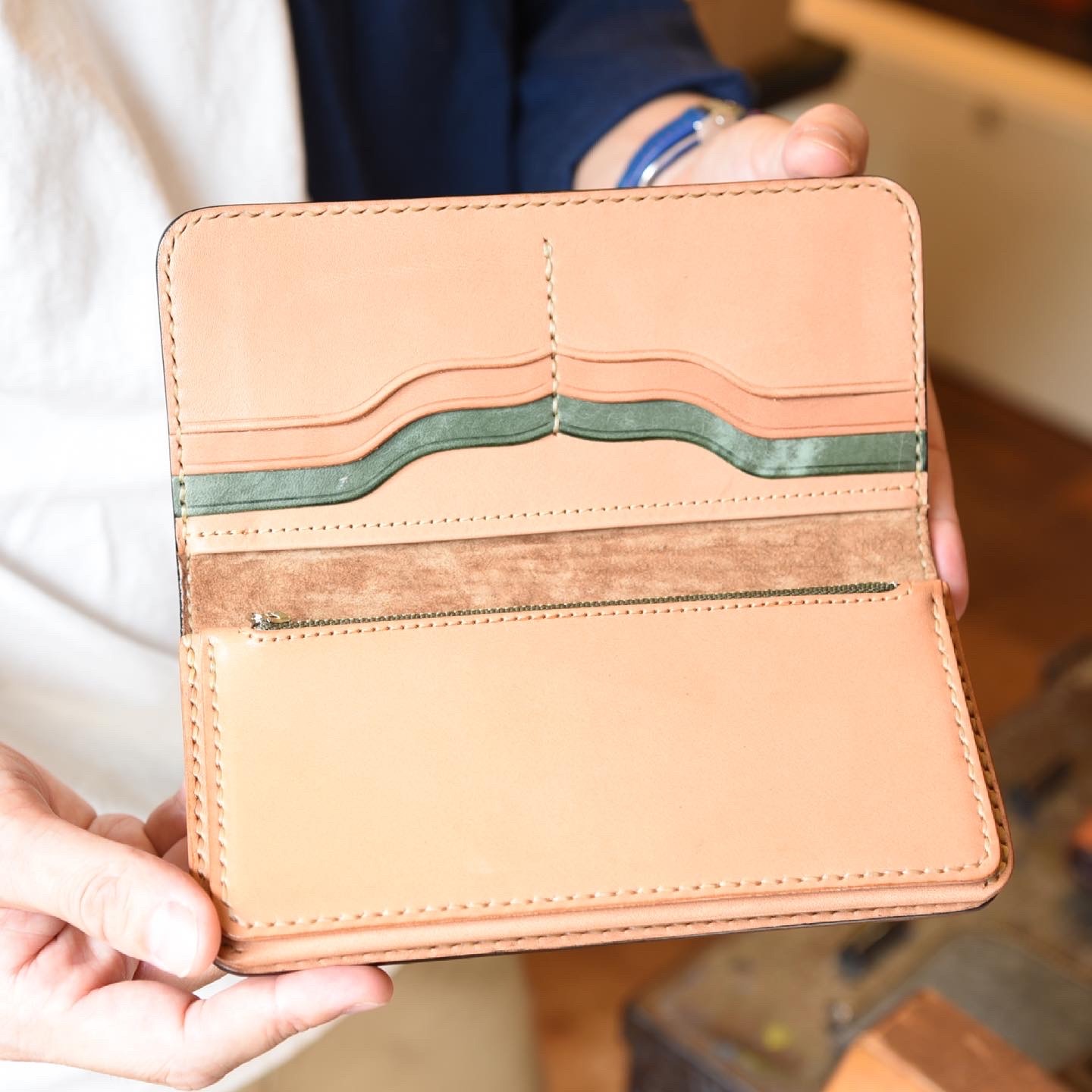 内側は、栃木レザー社製グレージングレザー(ヌメ)×イタリアインポートヌメ(グリーン)
