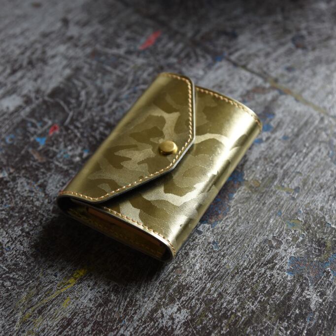 箔押しのゴールドに迷彩柄が見え隠れする、珍しいレザーを使用した小さいお財布パルムです。