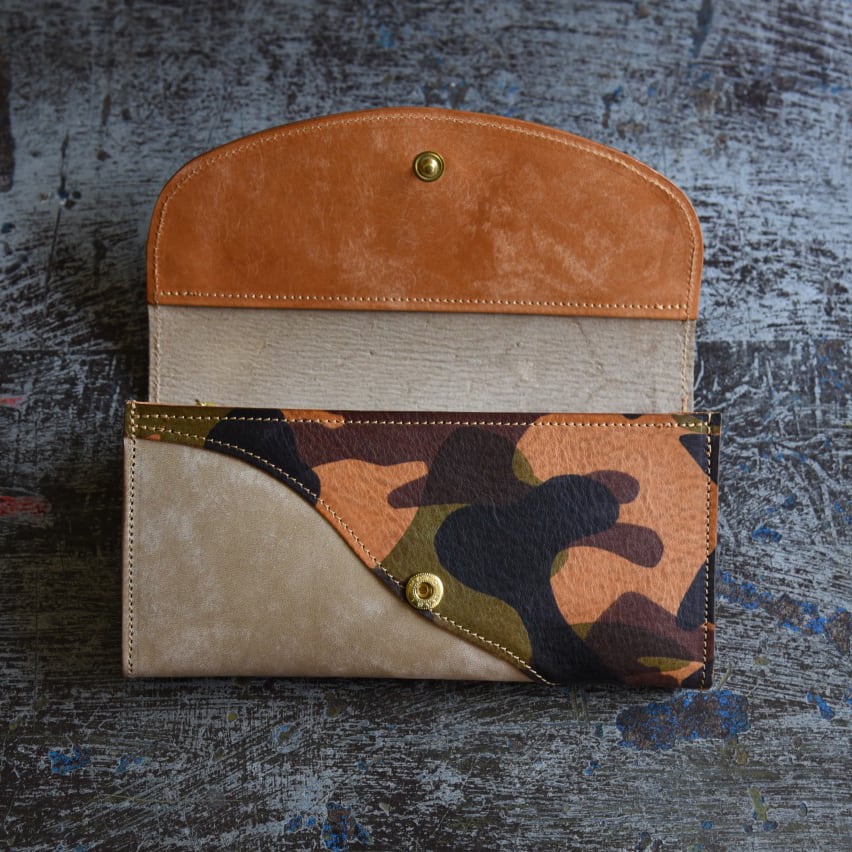 表面にバフ加工を施した革やロウを引いてある革、迷彩柄の革などを継ぎ合わせたカラーリングは全て1点ものになります。